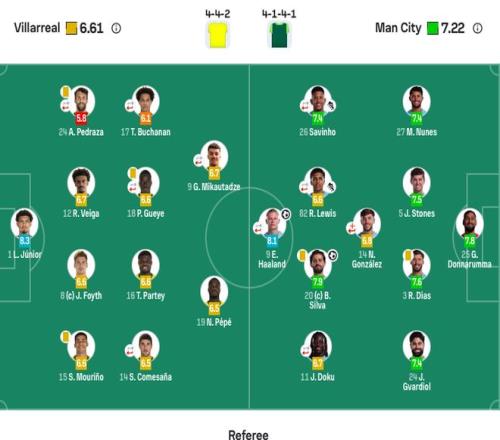 比利亚雷亚尔首发:1-路易斯·儒尼奥尔、15-穆里尼奥、8-福伊特、12-维加、24-佩德拉萨(46’23-卡尔多纳)、17-布坎南(66’20-莫莱罗)、14-康萨尼亚(72’22-阿约泽·佩雷斯)、16-托马斯、18-帕佩·盖耶(81’10-帕雷霍)、19-佩佩、9-米卡乌塔泽(66’21-奥卢瓦塞伊)。