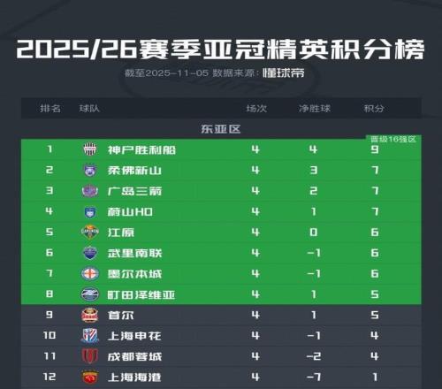 北京时间11月5日,亚冠精英联赛阶段东亚区第4轮的比赛全部结束,中超三队包揽榜尾,海港垫底。